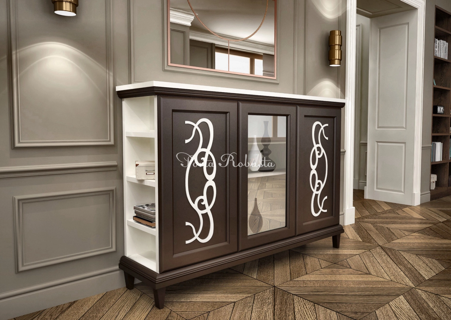 Мебельные фасады имеют посеребрённый уникальный врезной декор и установлены на петли со встроенными амортизаторами Hettich (Германия). Оснащены системой Push to open.